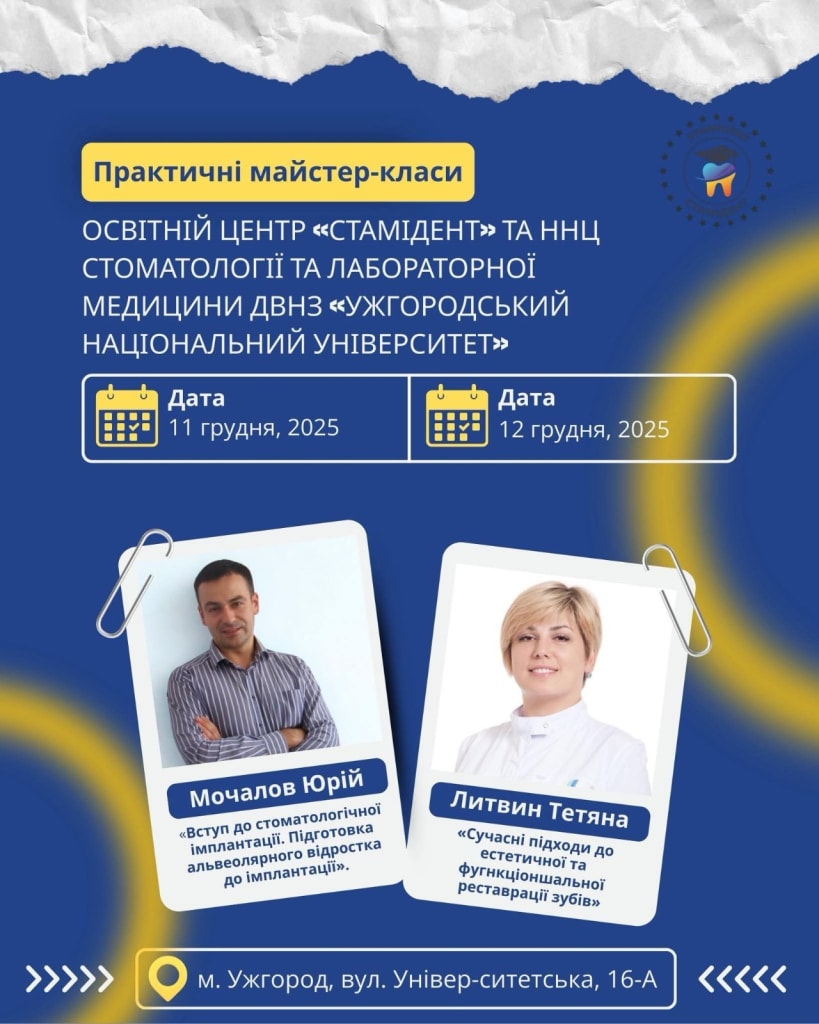 Освітній центр «Стамідент» спільно з ННЦ стоматології та лабораторної медицини ДВНЗ «Ужгородський національний університет» запрошують вас на серію практичних, високоефективних майстер-класів для стоматологів.